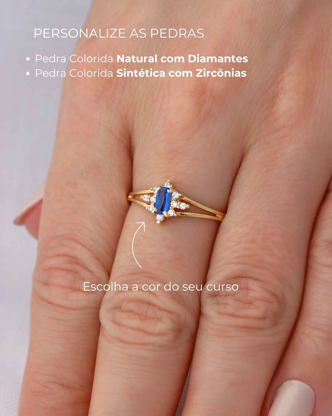 Comemore sua formatura com o Anel Formatura Baguete Aro Duplo Ouro 18K, uma joia deslumbrante e delicada. Apresentando uma pedra lapidada em formato baguete de 5mm x 3mm e 10 brilhantes (ou zircônias), esse anel é perfeito para uso diário e permite várias combinações com outros anéis. Personalize-o com a pedra que representa seu curso, escolhendo entre pedras naturais ou diamantes preciosos, ou pedras sintéticas e atraentes zircônias. Feito com ouro maciço 18K, essa joia é resistente e garantida para durar a vida toda, proporcionando segurança e conforto. Personalize o anel com a pedra colorida do seu curso e selecione entre pedra natural com diamantes ou pedra sintética com zircônias.
