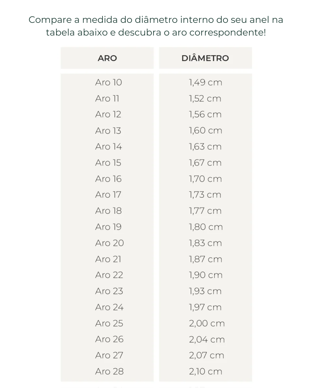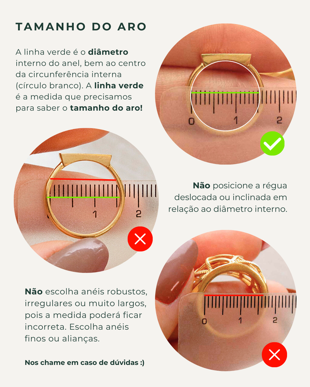 O ajuste de anéis e alianças é GRATUITO para o aumento ou redução em até 2 (dois) números, com exceção de: (1) alianças com cravação em linha ou em toda a volta, (2) peças que necessitem de uma nova gravação ou (3) peças que necessitem de acréscimo de material para serem ajustadas.