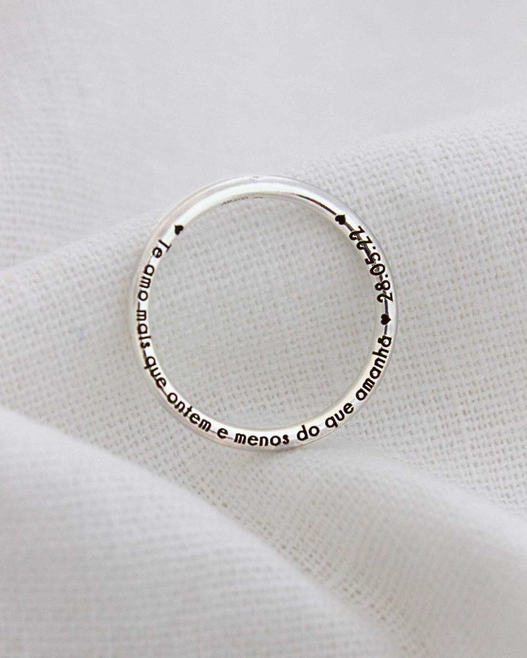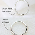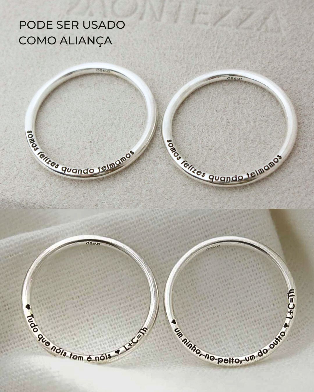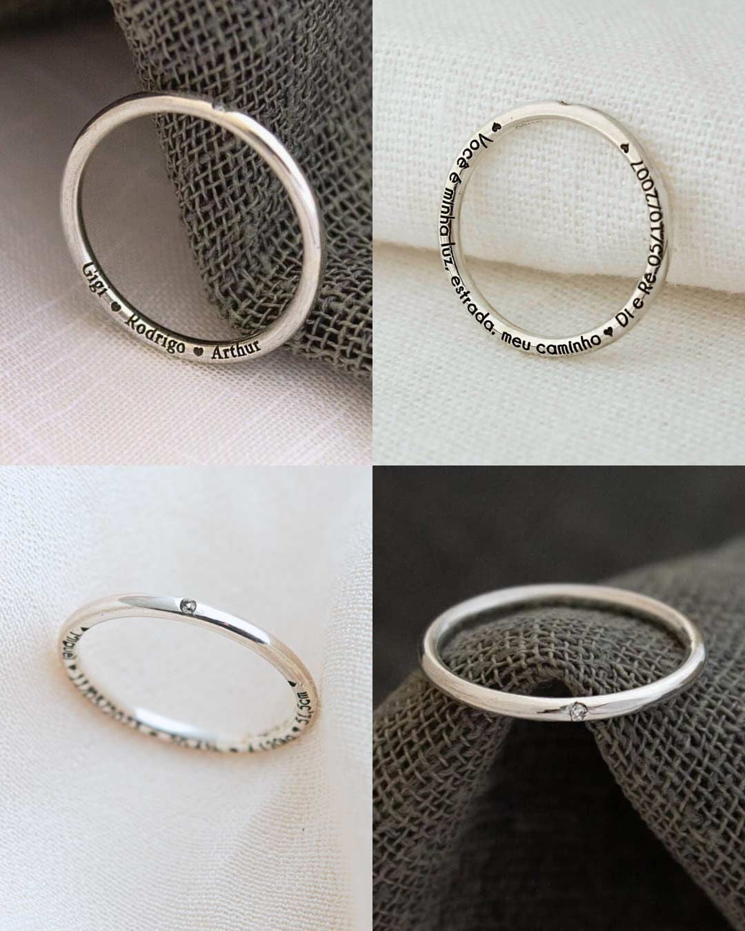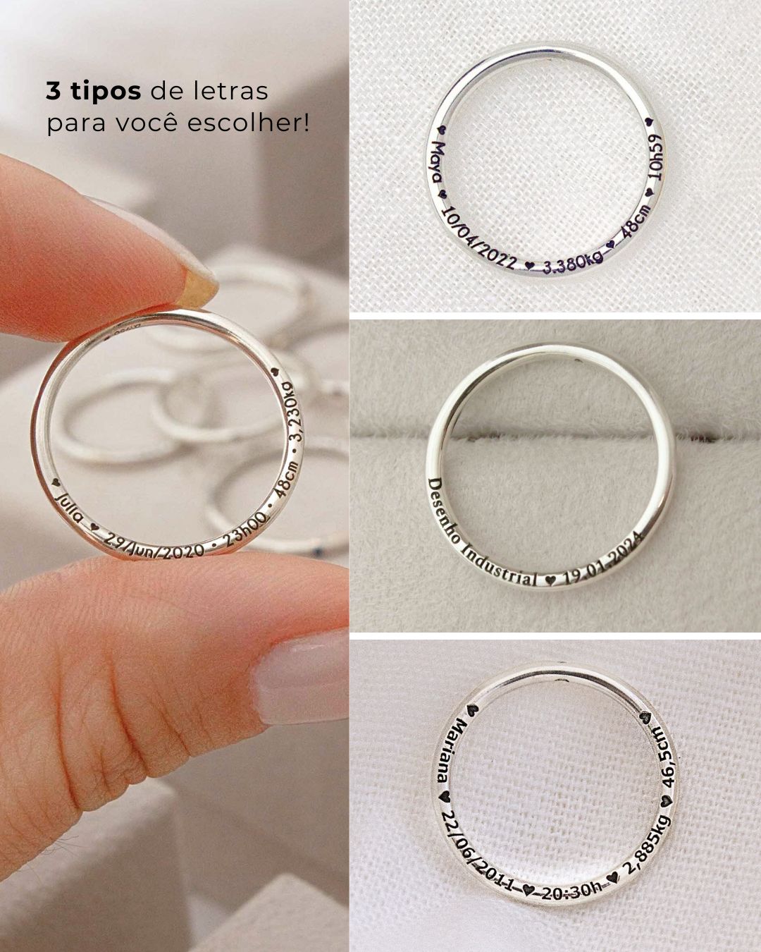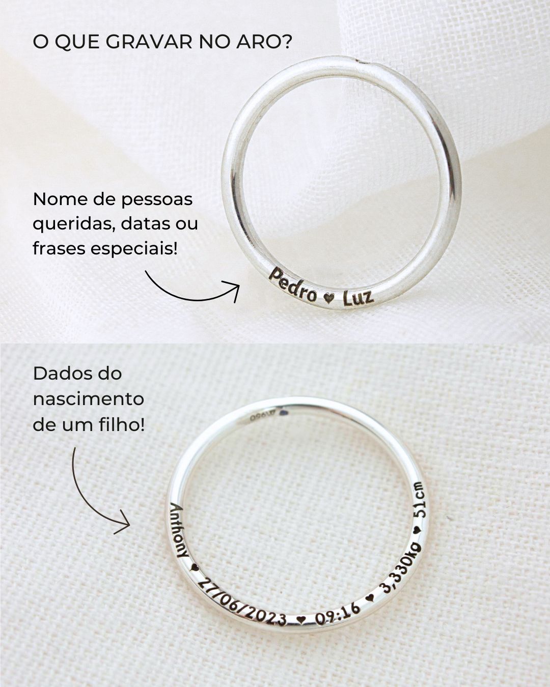 Escolha entre 3 estilos de letras para eternizar mensagens no aro. Grave os dados de nascimento de um filho, nomes de pessoas queridas, datas ou frases especiais!