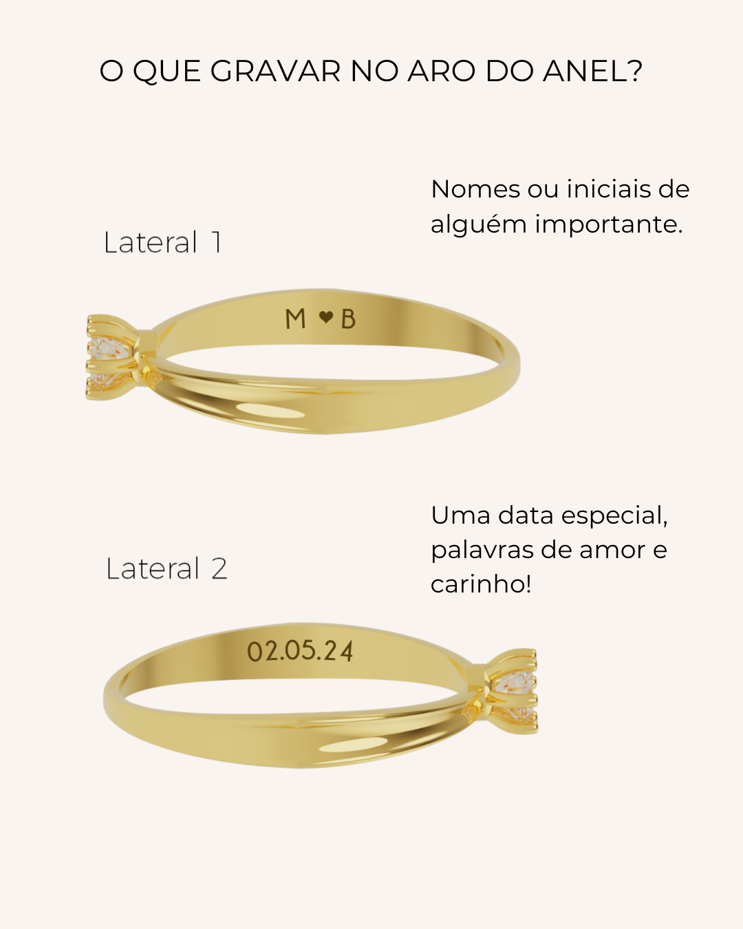 Você pode escolher uma pedra natural (diamante) ou uma pedra sintética (zircônia); e também personalizar o aro com datas marcantes, nomes de pessoas queridas, uma palavra ou frase que seja especial e muito mais!