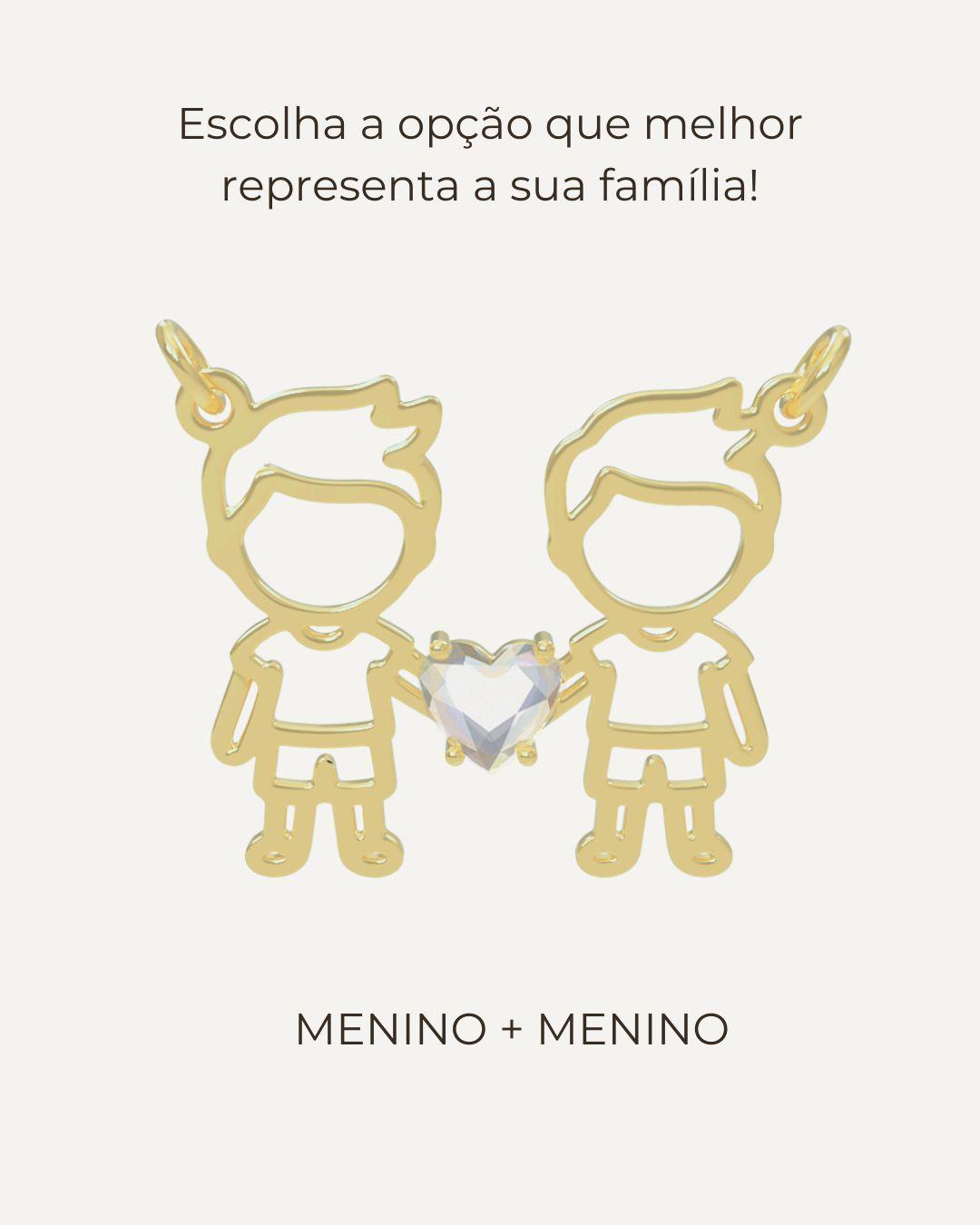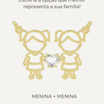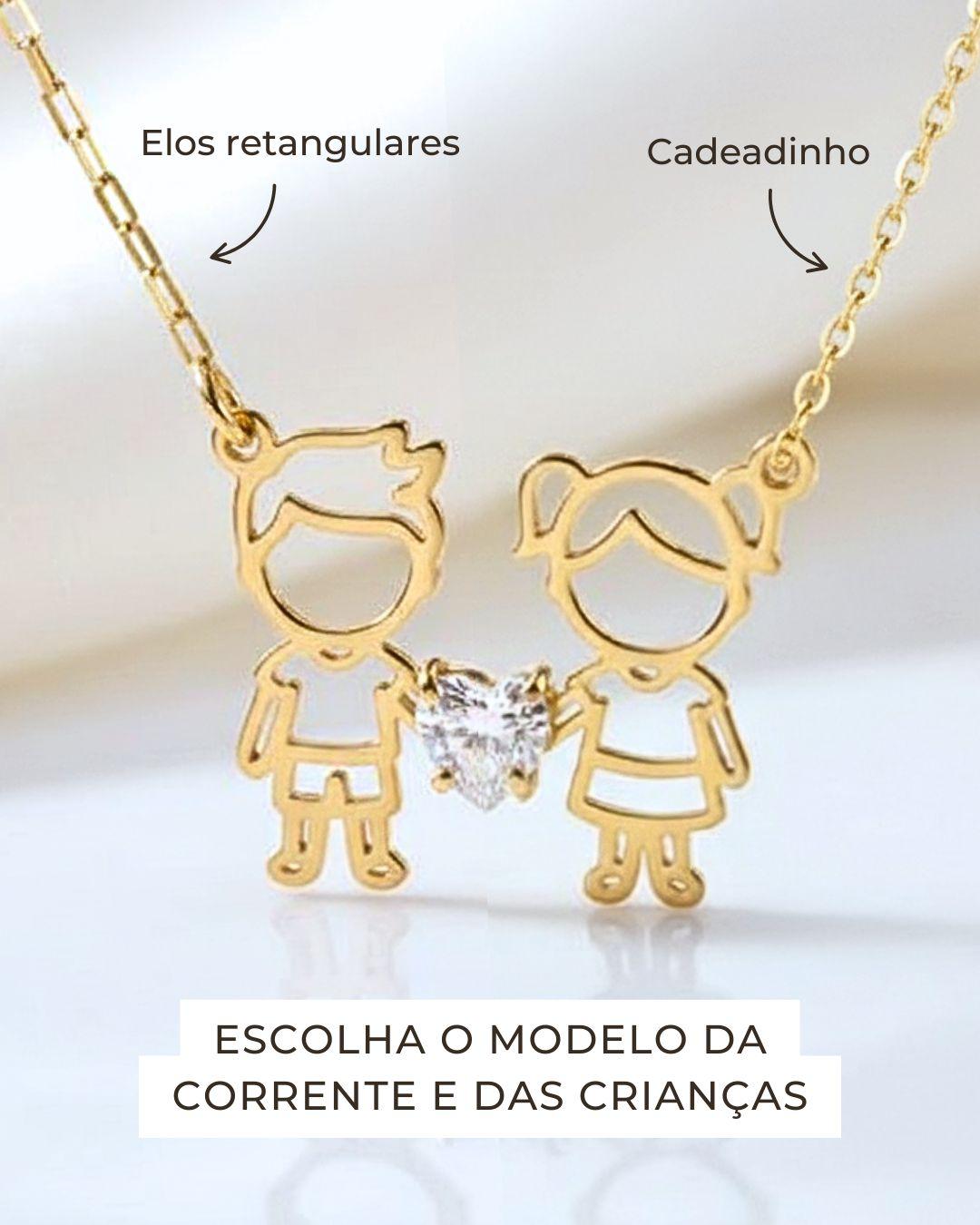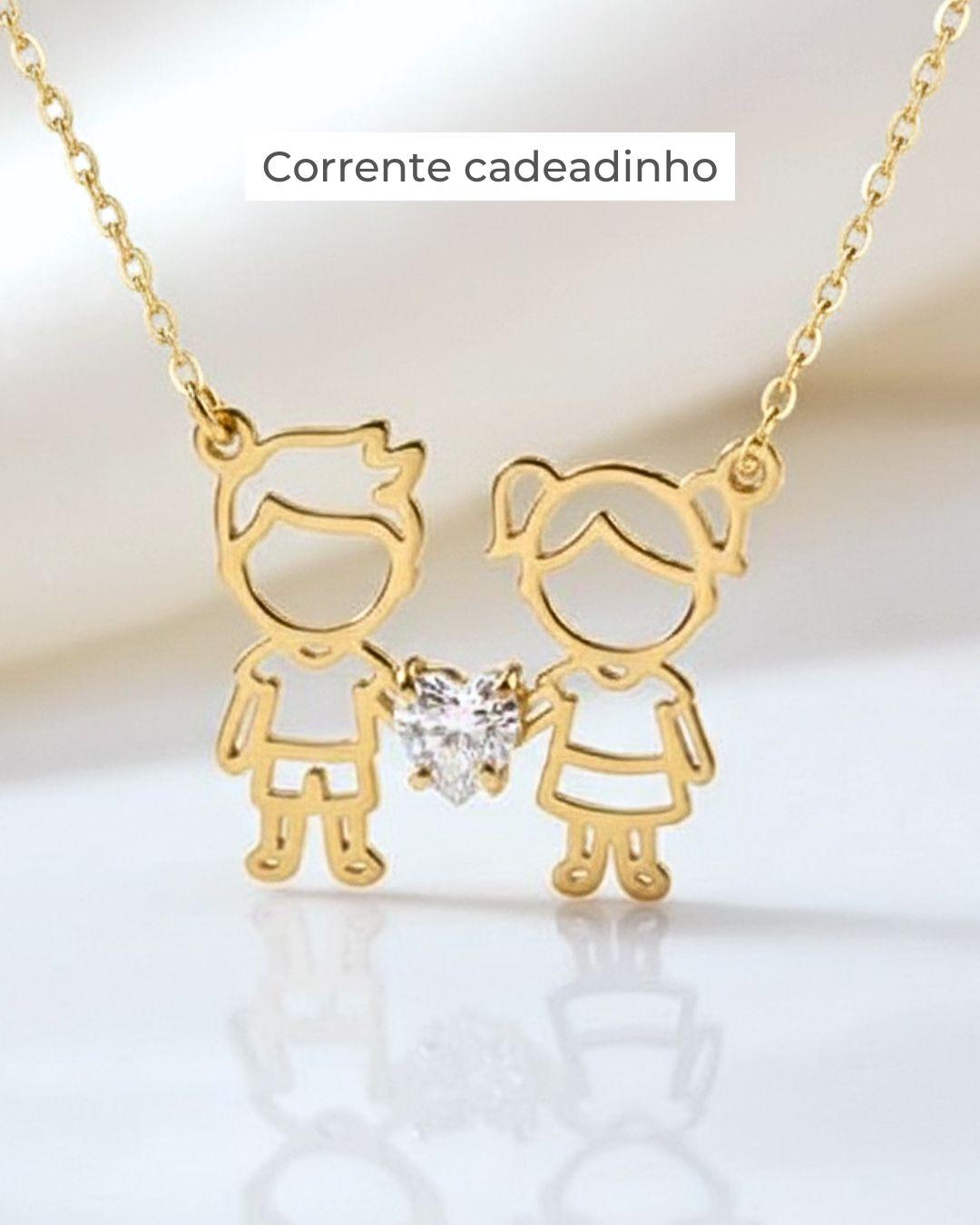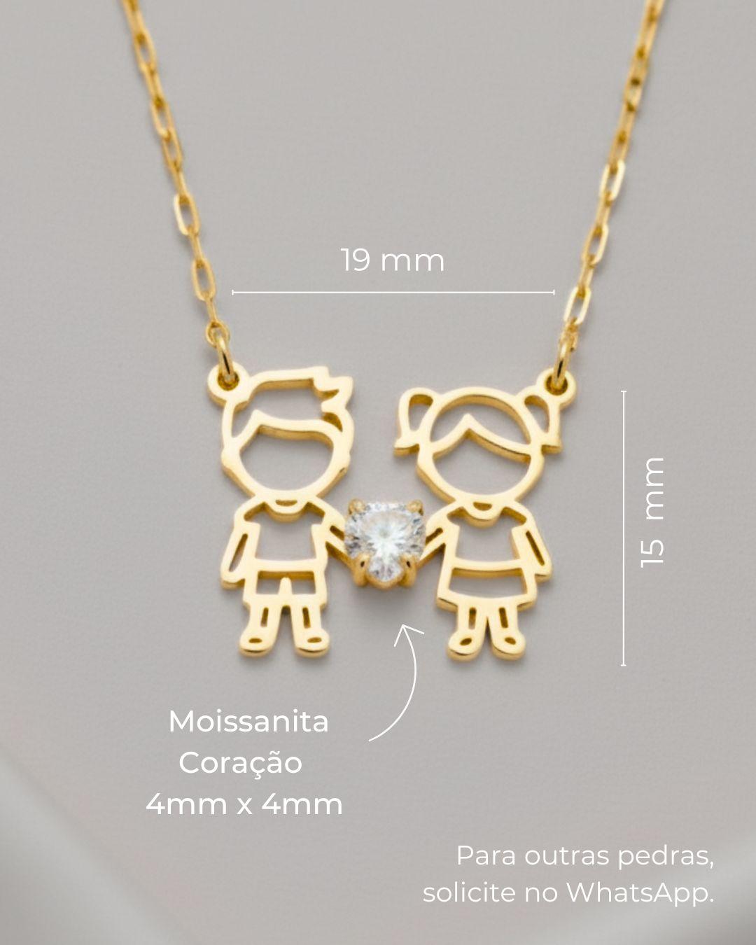 O colar Meus Pitocos é feito em Ouro 18K e traz um desenho de duas crianças de mãos dadas, unidas no centro por um coração delicado em moissanita, pedra conhecida pelo brilho intenso e duradouro.