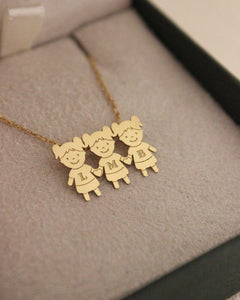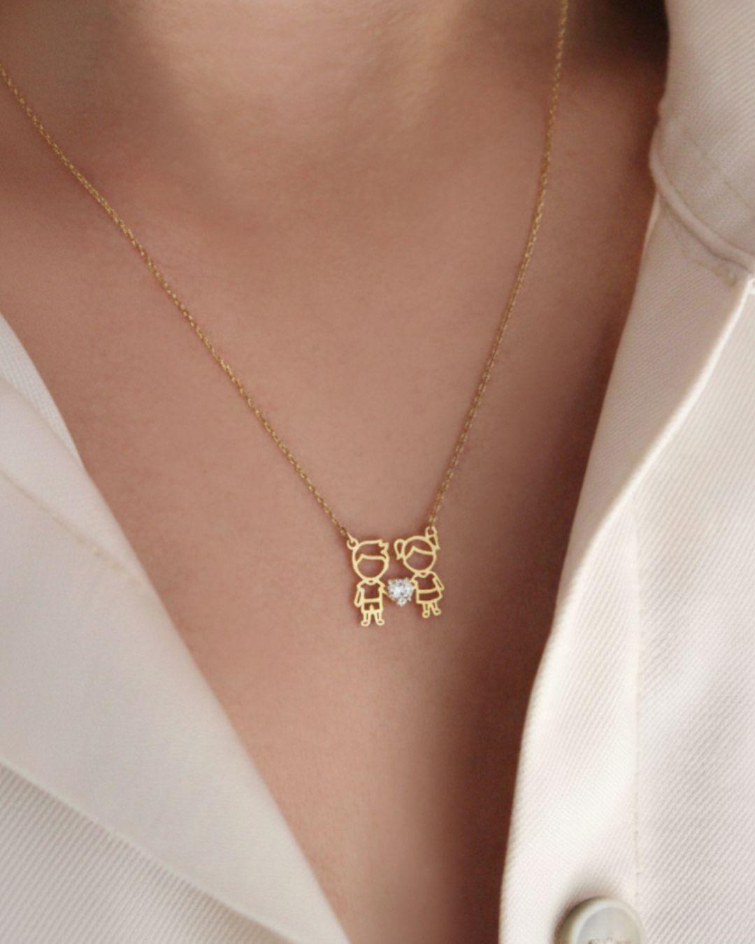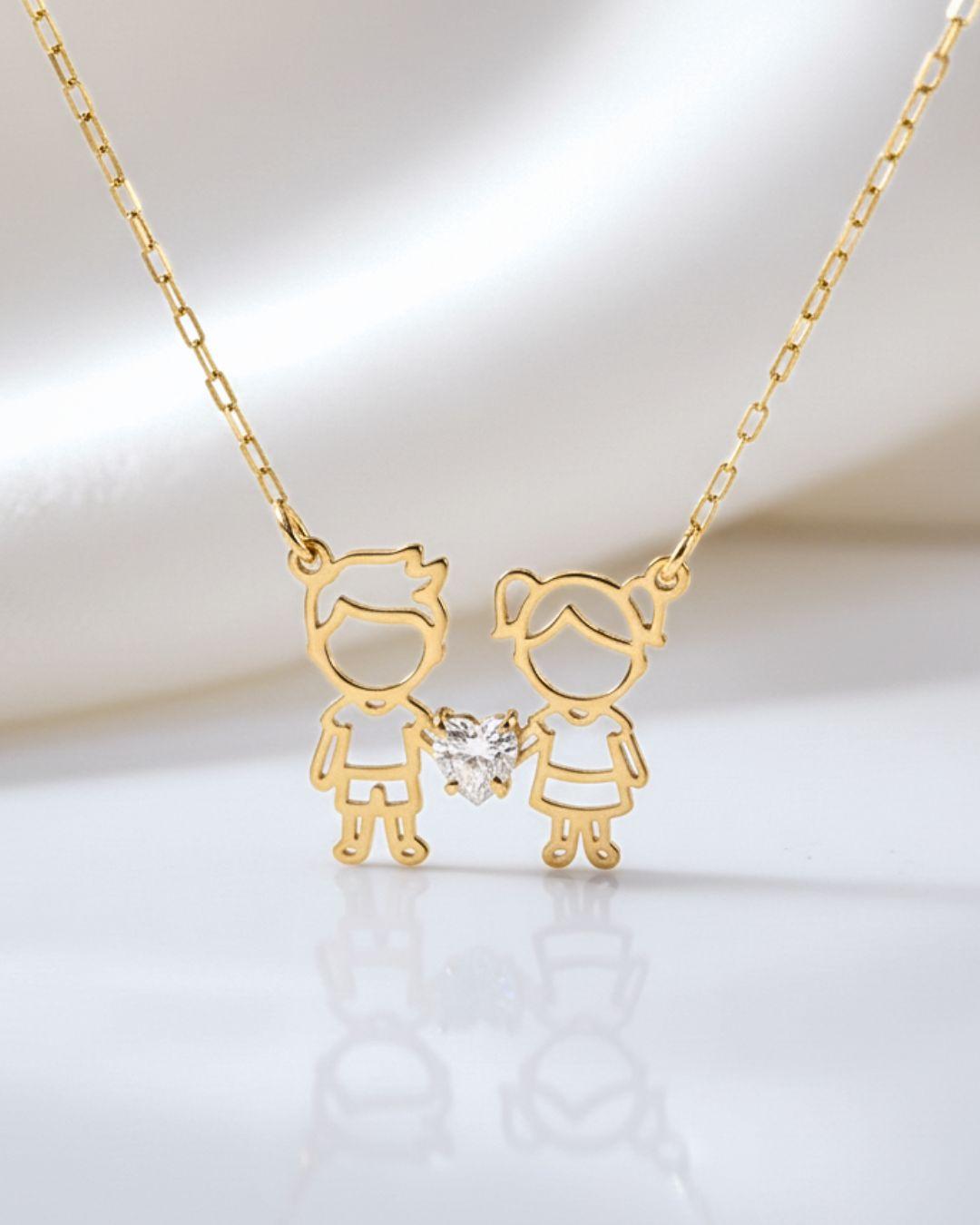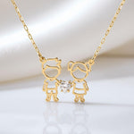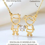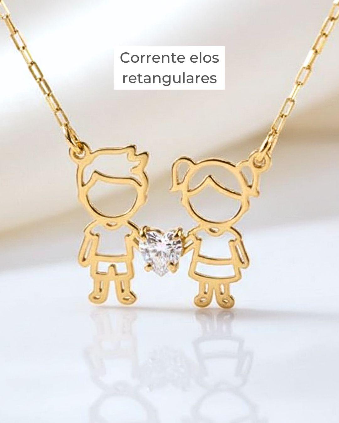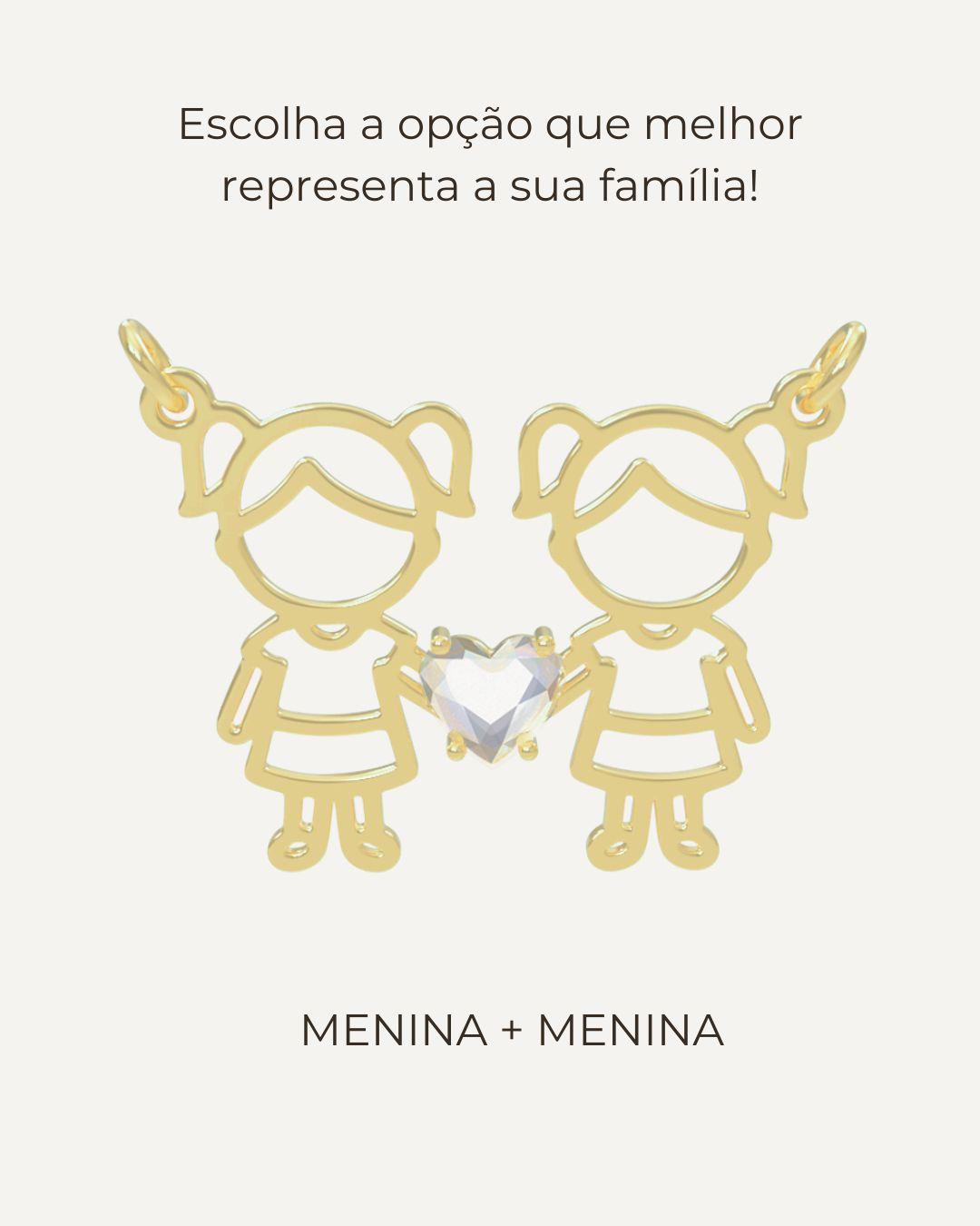 O colar Meus Pitocos é feito em Ouro 18K e traz um desenho de duas crianças de mãos dadas, unidas no centro por um coração delicado em moissanita, pedra conhecida pelo brilho intenso e duradouro.