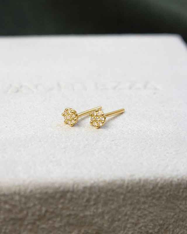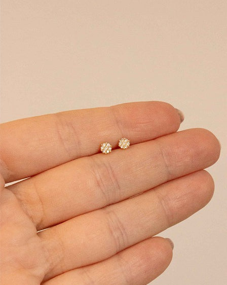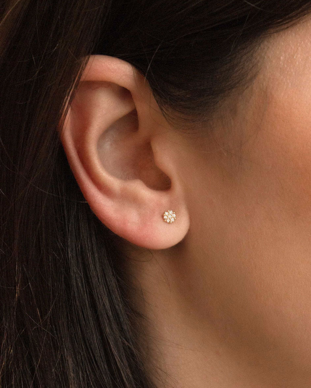 O Brinco Baby Flor Pavê de Diamantes Ouro 18K é uma peça delicada com cravação de 7 diamantes em formato de flor.