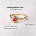 O Anel Formatura Redondo Aro Delicado Ouro 18K é uma joia delicada e atemporal, perfeita para usar no dia a dia e fazer mix com outroa anéis. Esta joia é confeccionada em ouro maciço 18K, um material extremamente durável e cravejado com uma pedra redonda colorida e 10 brilhantes (ou zircônias) ao redor.
