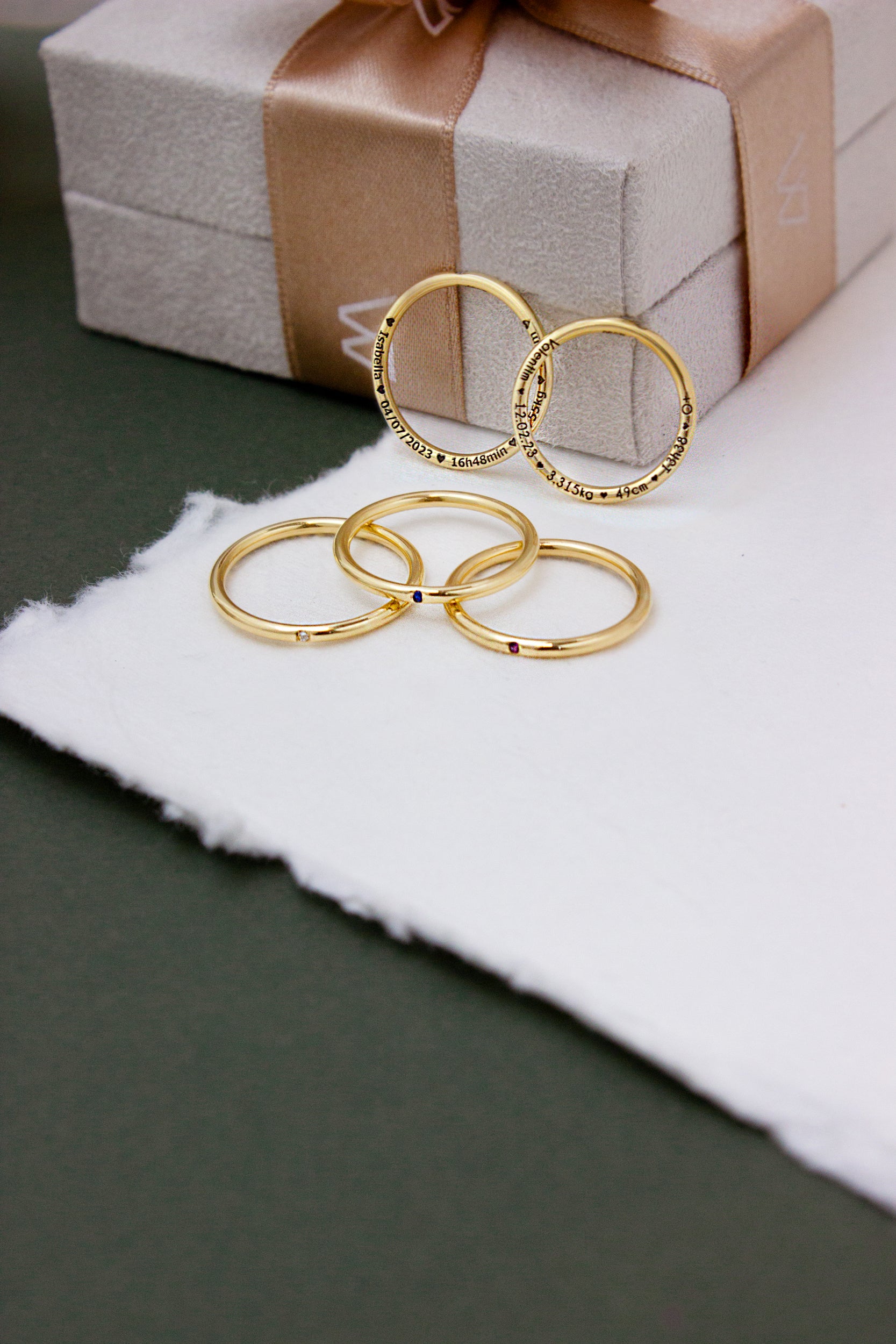 Modelo Aro Clássico: Possui uma travessa no topo onde é possível adicionar uma palavra de até 20 caracteres e escolher um estilo de fonte, de forma personalizada. O formato do aro é meia cana com largura de 1,5 mm.